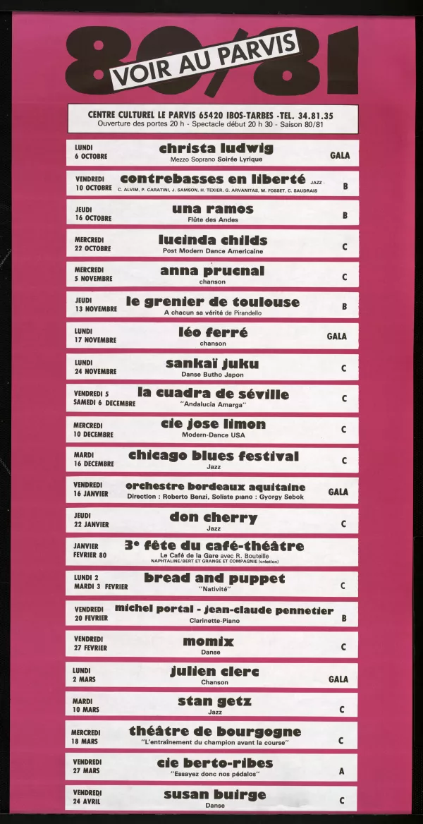 Et dès 1980, elle est sur la scène du Parvis avec sa compagnie. Quatre pièces récentes sont présentées, toutes dans ce style très personnel qu’elle a inventé et qui consiste à reprendre un même enchaînement de mouvements plusieurs fois tout en y introduisant d’infimes variations. Une danse minimaliste, énigmatique et envoûtante à la fois, qui fait écho aux compositions musicales de Glass, Reich et Riley. Comme Carolyn Carlson et Trisha Brown (qui viendra au Parvis en 1993), Lucinda Childs illustre à quel point la danse contemporaine américaine a irrigué plusieurs générations de chorégraphes en Europe.