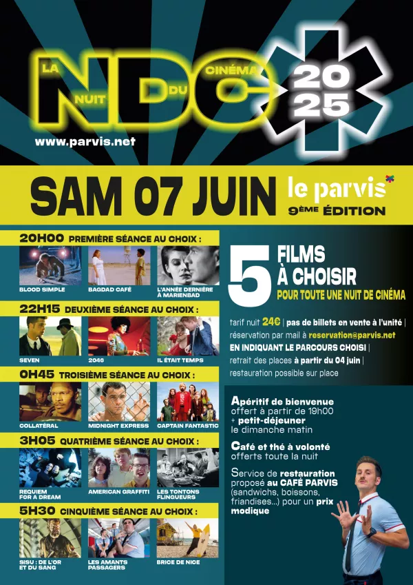 9ème édition de la NUIT DU CINÉMA au Parvis ! Programmez votre parcours en choisissant 5 films parmi 3 propositions à chaque horaire et c'est parti pour toute une nuit de cinéma ! Prévoyez des vêtements confortables, votre oreiller, votre plaid... et même votre doudou si vous voulez.