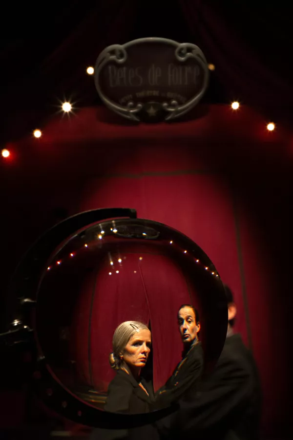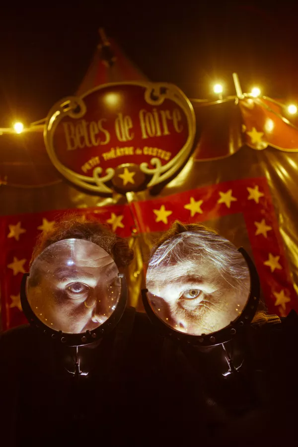 Costumière mais aussi comédienne pour des compagnies de théâtre de rue, Elsa de Witte connaît bien le rafistolage, la bidouille et l’art du recyclage. Laurent Cabrol, passé par l’école d’Annie Fratellini, le cirque Romanès et cofondateur du cirque Trottola avec Titoune et Bonaventure Gacon, en a gardé un goût affirmé pour des spectacles maison à dimension humaine. En famille, ils nous parlent d’eux. Bêtes de foire n’est rien d’autre que leurs parcours de scène et de vie où s’emmêlent la marionnette, le théâtre, la danse, les arts du cirque et surtout la magie de créer du rêve avec deux bouts de ficelle et trois fois rien.