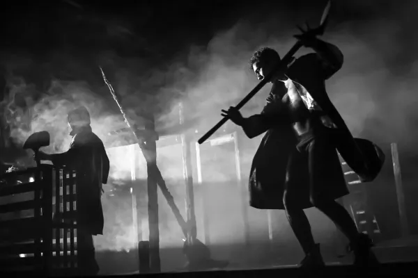 C’est dans une ambiance de fin de règne raté que débute la pièce. Le vieux tyran – interprété par l’immense comédienne Claude Degliame – a tout perdu et attend sa dernière heure au fond d’un cachot. Son passé violent et ses pulsions de débauche reviennent le hanter. Devant lui, défilent la reine assoiffée de pouvoir, des barons haineux et revanchards et surtout l’irrésistible et vénéneux Gaveston, son amour subversif. Parmi les décombres calcinés de sa mémoire, se dessine une danse macabre tantôt grandiose tantôt grotesque.