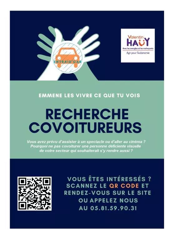 Si vous avez prévu d’assister à un spectacle ou à un film et que vous êtes intéressés pour covoiturer une personne déficiente visuelle de votre secteur souhaitant se rendre au même événement, rendez-vous sur le site de covoiturage géré par l’Association ou appelez directement au 05 81 59 90 31.